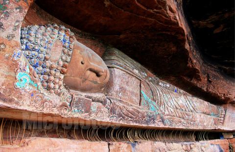 臥佛院摩崖造像位于四川省安岳縣城北面25公里的八廟鄉(xiāng)臥佛溝,以其臥佛大像和石刻佛經(jīng)聞名于世。臥佛鐫刻在距地面5米的崖壁上,全長23米,頭長3米,肩寬3.1米。它 背北面南,頭東足西,左側(cè)而臥。臥佛形體修長,身著袈裟,面部豐盈,神態(tài)安祥,雙目微閉,似睡非睡,展現(xiàn)出釋迦牟尼涅槃時那超脫一切的意境。臥佛溝南面的 石壁上,有15窟經(jīng)龕,規(guī)模大小不等??探?jīng)面積達(dá)130多平方米,經(jīng)文目錄繁多,內(nèi)容極其豐富。主要經(jīng)目有《大唐東京大敬愛寺一切經(jīng)論目序》、《佛名 經(jīng)》、《大般涅槃經(jīng)》、《般若波羅密多心經(jīng)》、《佛頂尊勝陀羅尼經(jīng)》、《妙法蓮花經(jīng)》等。這裡是我國寶貴的石刻經(jīng)庫。 (資料來源:石工坊雕刻)