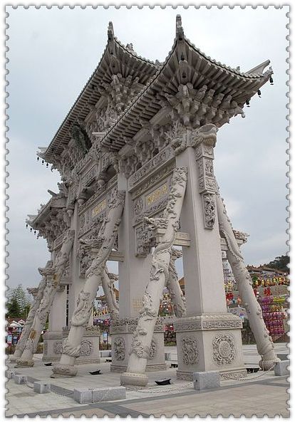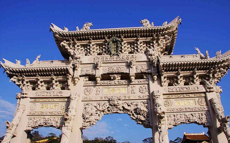 整座山門造型獨(dú)特,兩側(cè)護(hù)衛(wèi)山門的八根特殊龍柱,又稱“福賜八大龍金剛”,與山門形成穩(wěn)固的三角形,這在全國的石質(zhì)山門中絕無僅有。支撐山門的其他柱子則采用了多重疊加方式,先垂直后倒掛,遍布整座山門有100多條龍,象征著富貴和吉祥。據(jù)報(bào)載山門的修建請(qǐng)來了近60名一流的福建惠安石雕師傅,前后耗時(shí)3年,耗資1000萬元左右。