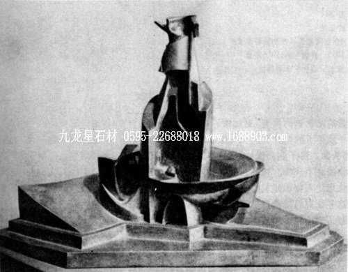 波菊尼在《未來主義雕塑技巧的宣言》中主張“絕對(duì)和完全廢除確定的線條和不要精密刻劃的雕塑。我們要把人物打開, 把它納入境之中……透明的玻璃、鐵塊、金屬絲、室內(nèi)和室外的燈光能夠表示平面、方向以及一種新的現(xiàn)實(shí)的調(diào)子和中間調(diào)子”。(6)未來主義者就是希望達(dá)到讓作品與環(huán)境、形體與空間互相貫穿。波菊尼在他的《空間中一個(gè)瓶子的發(fā)展》這件靜物雕塑上, 傳統(tǒng)的雕塑空間被擴(kuò)大。瓶子被解體后又重新構(gòu)成, 但作品此時(shí)已經(jīng)和介于它與環(huán)境之間的基座融為一體, 呈現(xiàn)一種向空間極度擴(kuò)張的態(tài)勢(shì)。這件僅有15英寸高的青銅作品卻能盤居著一個(gè)巨大的空間量。他還通過其它作品的實(shí)驗(yàn),驗(yàn)證了他在雕塑中所追求的永久價(jià)值——“運(yùn)動(dòng)的風(fēng)格”和“雕塑即環(huán)境”, 而這反倒是另一種對(duì)“未來”的預(yù)言:其“運(yùn)動(dòng)”真的波及到達(dá)達(dá)主義、超現(xiàn)實(shí)主義雕塑以及波普雕塑家環(huán)境流派的“環(huán)境”觀。