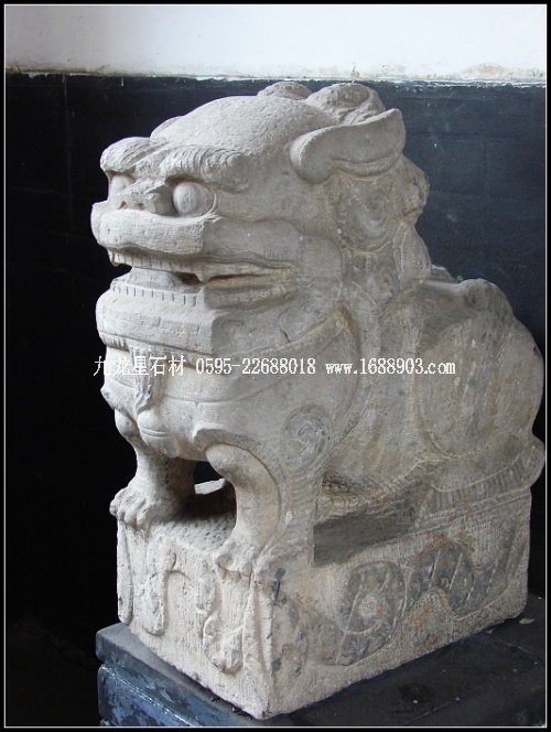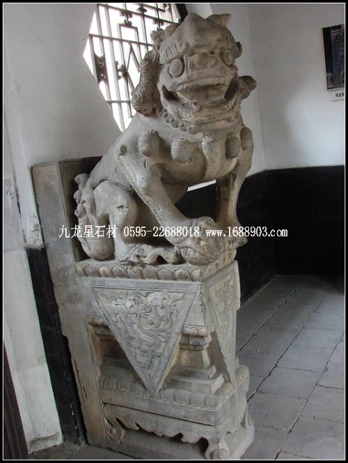 子是莊園青石雕刻的又一大類別。眾多的門墩石獅,經清代民間藝術家的大膽想象、沿承、夸張,這一藝術品成了宅第建筑中不可替代的裝飾像,無論體量大小,均威武、高貴而又憨態(tài)可掬。為增強裝飾效果,莊園的獅子形象大多頭大臉闊,額隆頰豐,箕口肉鼻,前額突出,從禿頂式的頭部到項背披有漩式鬣毛。胸飾纓絡華飾,脖上掛有鈴鐺,形態(tài)俯首縮足。雌獅掌撫幼獅,有的還背負其子;雄獅腳踏繡球或嘴銜彩帶,背負繡球,較多地汲取了民間傳統(tǒng)舞獅藝術的成分,富有較強的鄉(xiāng)土氣息和喜慶風格。