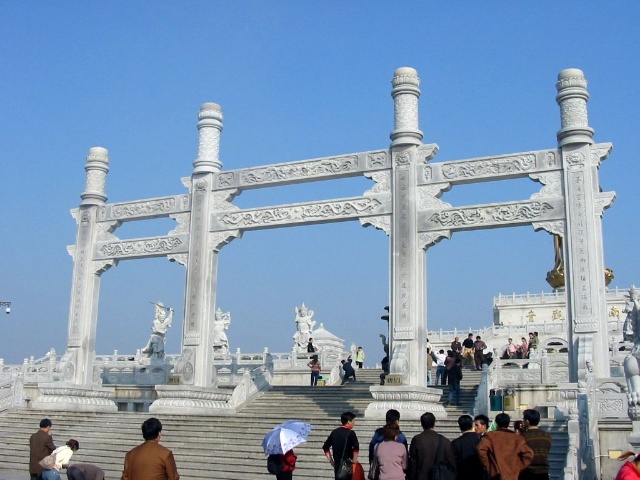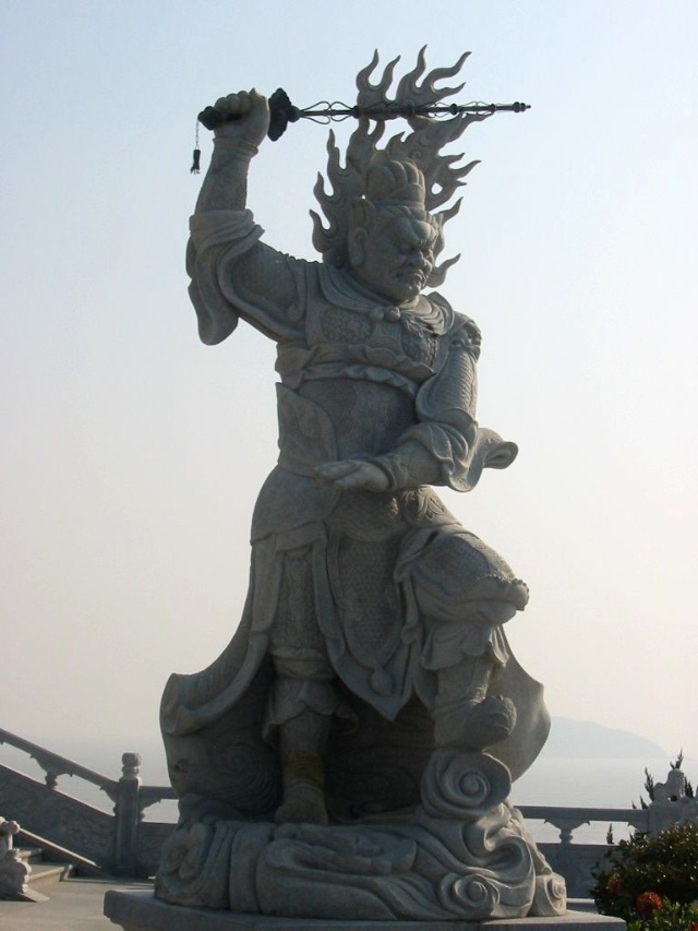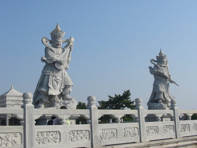 禮佛廣場(chǎng)上四大天王塑成了中國(guó)古代的武將形象,這是古印度佛教傳入中國(guó)后,佛教文化和中華文化相圓融的結(jié)果。 “這四大天王塑像的原形,他們的出身并不是很高貴,而是屬于那種“放下屠刀,立地成佛”的人物。四大天王原形的由來(lái),源于古典小說(shuō)“封神演義”中“魔家四將”。在周武王率兵起義,反對(duì)暴虐的無(wú)道君主——商紂王的正義戰(zhàn)爭(zhēng)中,這魔家四兄弟曾經(jīng)率兵于佳夢(mèng)關(guān)一線阻擋周武王東進(jìn)的軍隊(duì)。經(jīng)過(guò)數(shù)番爭(zhēng)斗,結(jié)果是被周武王的軍隊(duì)盡數(shù)殲滅,魔里海、魔里青、魔里壽、魔里紅這四兄弟也亡命于周軍之手。戰(zhàn)爭(zhēng)結(jié)束后,這四個(gè)助桀為虐的“魔頭”,經(jīng)姜子牙開(kāi)封神榜時(shí),就被任命為“四大天王”。