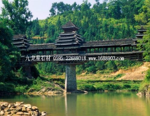 中國(guó)廣西省程陽(yáng)風(fēng)雨橋是最著名的屋頂結(jié)構(gòu)橋,建造于1916年。主要是由木頭和石材建造而成,風(fēng)雨橋總長(zhǎng)度為213英尺(約65米),橫跨林溪河。