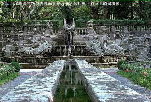 踏上三層臺地后順著長方形水池向半圓形噴泉望去。站在這一觀賞點總能給人驚喜,就像整幅油畫掛在眼前。兩個巨大河神分守兩旁的半圓形水池顯得那么的神秘幽深,配以長方形水渠,就像回到了過去。
