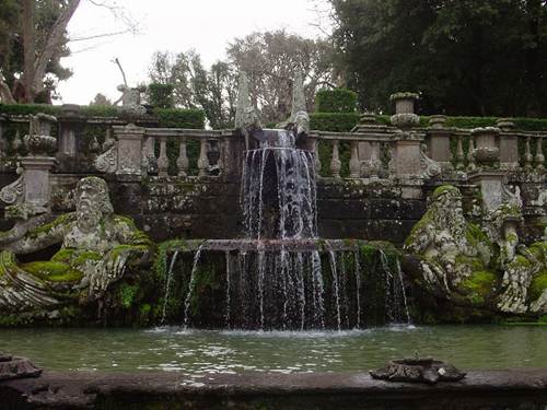 噴泉:蒙塔爾托主教入主別墅時期,他按照當年維尼奧拉的整體設計,繼續(xù)建造花園的中央噴泉--意大利風格主義雕塑家詹博洛尼亞(1529-1608)設計建造的"摩爾噴泉":4個石欄圍繞的水池,石欄上矗立著石雕花瓶,4個水池中央便是一組高聳的年輕運動員的輝煌雕塑,他們高高舉起象征著蒙塔爾托主教家族姓氏的"阿爾托山"。從遠處看去,這些有力的塑像十分宏大,黑黝黝地閃耀,以至于人們會認為它們是青銅,可是難以置信的是,它們是最好的、最堅硬的石灰華在陽光與水的作用下生成的一種堅硬如鐵的物質。后來意大利新古典主義雕塑大師卡諾瓦來到這里時,大為驚訝,他一邊拿起錘子輕輕敲打著它,一邊發(fā)出如此的感嘆:"它將比大理石更長久"。