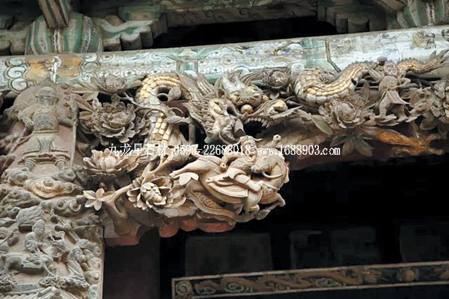 三義殿前廊上排列的四根人物石柱每根柱上都雕有人物故事。從東面往西看起:第一根石柱上雕刻的是人們熟悉的“郭子儀子婿拜壽”的場(chǎng)景片段:柱上“七子八婿,皆顯貴朝廷”。郭子儀端坐堂上,喜形于色,享受著兒女們的孝道之心。在其周圍,還有官員、女眷、士兵、家丁、童子、樂(lè)手等人物,姿態(tài)各異,栩栩如生。第二根石柱上人物更加豐富,從下到上處處分布著人物,主要故事為瓦崗寨的故事,立于城墻內(nèi)的人物分別有持月牙板斧的瓦崗寨寨主程咬金,慣用殺手锏的秦瓊,手拿梅花槍的羅成等。第三根柱子上雕刻的是悠然釣魚的姜太公,踏著風(fēng)火輪的哪吒三太子,凌空展翅的雷震子,游走地下的土行孫。第四根柱上,雕刻著盛唐時(shí)期山東壽張縣百歲老人張公藝九世同堂和治家有方的故事。(侯楠山)