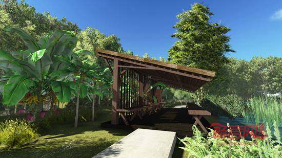 入世境為寺域前區(qū),作停車(chē)、暫時(shí)休整之用;山門(mén)為情境轉(zhuǎn)換媒介,拾階而上,山林夾道,洗滌心靈,是為出離境;寺院前部為平坦區(qū)域,以水田農(nóng)禪景觀為主,視野開(kāi)闊,設(shè)置放生池,種蓮養(yǎng)魚(yú),利用參天古樹(shù)和竹林營(yíng)造自然茶室,茶亭茶室與植物互為取景,交相輝映,分布錯(cuò)落有致,形成趣味的園林廊道系統(tǒng),一派世外桃源景象,是為出世境;寺廟殿宇區(qū)域?yàn)榘莘饍x式及僧人居住生活場(chǎng)所,以唐風(fēng)建筑及庭院為主,是為般若境;經(jīng)過(guò)禪堂,石階引向后山的祖師塔區(qū)域,在祖師塔上加茅草穹頂,暗示祖師結(jié)茅而居,是為涅槃境;寺廟后方沿山而建的禪修中心和善客堂,為禪修者提供的專修場(chǎng)所,用高大喬木和竹林與寺廟區(qū)分隔,獲得寂靜氛圍,是為入定境;后山密林深處,罕有人至,閉關(guān)獨(dú)居,悠然逍遙,是為云仙境。