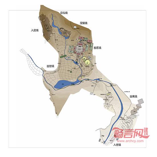 洞山,禪宗曹洞宗祖庭。設(shè)計(jì)理念在于借山林景觀表現(xiàn)農(nóng)禪景觀,在各個(gè)景觀節(jié)點(diǎn),用木構(gòu)建筑論釋禪境。建筑應(yīng)山水之體勢(shì),空間立所,起于山水又回復(fù)山水。逢渠、石、水面等則建橋廊等駐足憩息之地,讓位于場(chǎng)地態(tài)勢(shì)和氣象,得自然之昭示與引領(lǐng),以會(huì)祖師之意。整體敘事結(jié)構(gòu)為禪修次第意向組成的系列空間,景移心異,逐次第開(kāi)。建筑群有明確軸線控制,背山面池,景觀空間布局按照禪修境界分為七個(gè)區(qū)域:入世境、出離境、出世境、般若境、入定境、涅槃境、云仙境,形成整體推進(jìn)的修行秩序氛圍之場(chǎng)所。