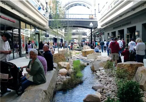 溪流石景使城市商鋪中多了自然元素,成為一道別致風(fēng)景線,吸引更多人前來,同時提供了沿路休息的座位。
