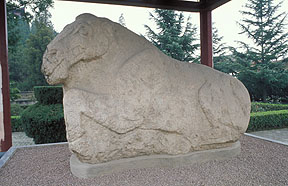 古代陵園石雕遺存實(shí)物最早的是引人注目的西漢霍去病墓石雕,作品原在陜西省興平縣漢武帝茂陵?yáng)|面霍去病墓上與墓前?,F(xiàn)已發(fā)現(xiàn)的石雕作品有造型各異、天趣宛然的動(dòng)物、人物等共十四件。霍去病為西漢名將,漢武帝為表彰其功、紀(jì)念其人,于茂陵?yáng)|面選定其墓址并“為冢象祁連山”,據(jù)《史記?衛(wèi)將軍驃騎傳?索隱》記:其墓“冢上有豎石,前有石馬相對(duì),又有石人”。今存作品即記載中的部分原物。它們可以分為兩類,一是通常被稱之為“馬踏匈奴”的立馬,二是其它渚石。立馬的原在位置是墓前不遠(yuǎn),長(zhǎng)年來(lái)未有大的移動(dòng),從形式上看為靜立姿態(tài),尺度適中,符合一般早期墓前石雕的制作規(guī)律,相信此即記載中相對(duì)而立的石馬,只是另一件已無(wú)存,“石人”也不見了。唐薛逢《漢武帝祠》詩(shī)云:“茂陵煙雨埋弓箭,石馬無(wú)聲蔓草寒”。詩(shī)中所指茂陵石馬當(dāng)系帝陵制度,但與霍墓立馬的位置及造型表現(xiàn)肯定有直接關(guān)系。西漢時(shí)期陵園墓前設(shè)置石雕已成風(fēng)氣,關(guān)于石人石獸的記載與遺存并不罕見,因此霍去病墓前石馬并非例外,實(shí)屬常規(guī)設(shè)置,它為我們提供了代所完善的石象生設(shè)置與造型形式之源的現(xiàn)知最早實(shí)物證據(jù)。