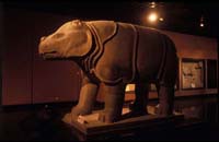 除石立馬外的諸石雕倒是例外,近年來(lái)有的學(xué)者根據(jù)實(shí)地勘測(cè)和史書記載提出了霍去病墓石雕群原在墓上的結(jié)論,認(rèn)為即是“冢上豎石”。這一說(shuō)法是可信的,為探索西漢石雕藝術(shù)提供了新的證據(jù)?!盀橼O笃钸B山”,豎石象各種猛獸物,賦予陵墓一種天然氣象,象征性再現(xiàn)墓主征戰(zhàn)建勛的環(huán)境,這不僅在形式上是一種創(chuàng)新,于當(dāng)時(shí)流行的形式之外另辟蹊徑,而且在陵園造型藝術(shù)觀念上也是就一種突破,它已經(jīng)于原來(lái)的厭勝辟邪寓意上增加了再現(xiàn)生前環(huán)境、表達(dá)人與自然之和諧關(guān)系的新層次,這種觀念層次本質(zhì)上為唐代所繼承。在這里,石雕群體配置構(gòu)成廠“祁連山”參差錯(cuò)雜的起伏形狀,同時(shí)表達(dá)了自然環(huán)境的豐富生命內(nèi)涵。熊、豕、虎、象采取各不相同的姿勢(shì)活躍于祁連山所代表的大自然中,同時(shí)它們又以用因材施雕的簡(jiǎn)練手法表現(xiàn)的自然生命的形象充當(dāng)著山峰的構(gòu)成部分,給山形以活力,墓主的靈魂將在這樣一個(gè)熟悉的氛圍中得到慰藉,人的意志在這樣的自然環(huán)境中得以強(qiáng)化。這種獨(dú)特的設(shè)計(jì)處理通過旌揚(yáng)墓主功勛的形式而寄托著對(duì)人中意義的理解與追求。
