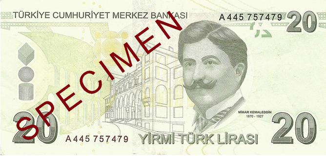 卡梅雷丁是奧斯曼晚期著名的土耳其建筑師,將傳統(tǒng)的奧斯曼與歐洲風格相結合?,F(xiàn)行的20里拉紙幣背面印有卡梅雷丁和他主要的作品之一,安卡拉Gazi大學(Gazi University in Ankara)。