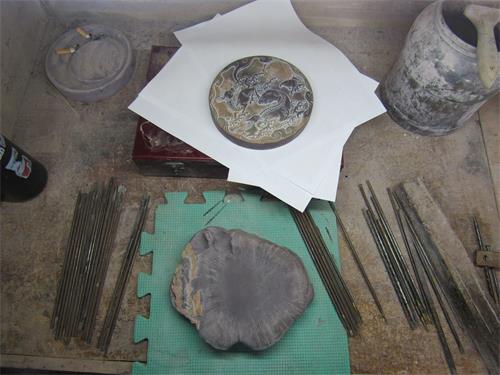 工作臺上放著一方尚未完工的硯臺,是幾朵的蘑菇的形態(tài)。應調研團成員的要求,胡楊老師給調研團的成員們展示了現(xiàn)場雕刻,他用一根細長頭尖的鑿子輕輕地雕刻一只爬在蘑菇上的螞蟻,每一鑿,不論力度還是位置都十分精準,令調研團成員非常欽佩贊嘆。胡楊老師表示自己還是很向往大師陳端友歷時三十載制成九龜荷葉形端硯的精雕細琢,他們應該將生活節(jié)奏放慢,只有摒棄五光十色的浮華,寧靜淡泊,才可以在石雕雕刻的道路上有所感悟、有所收獲。