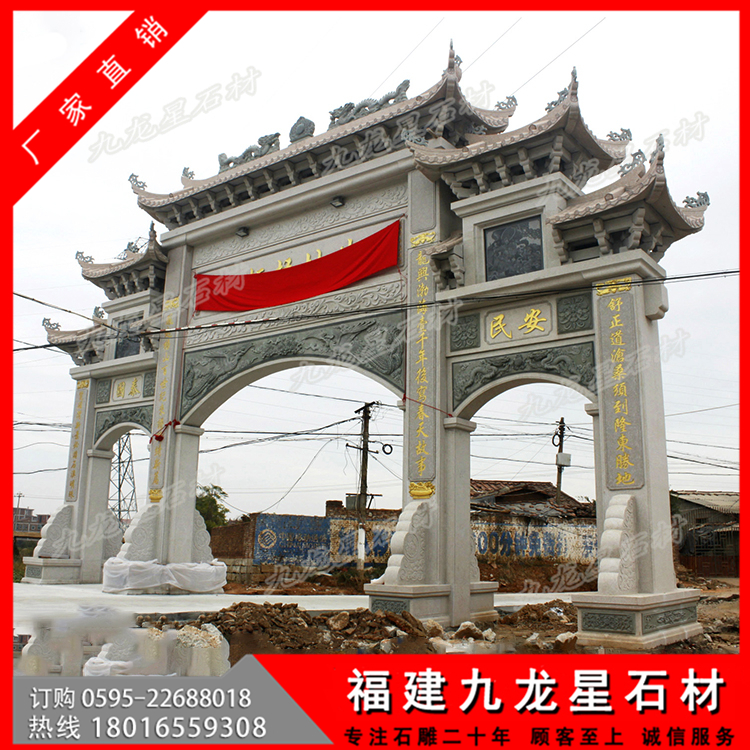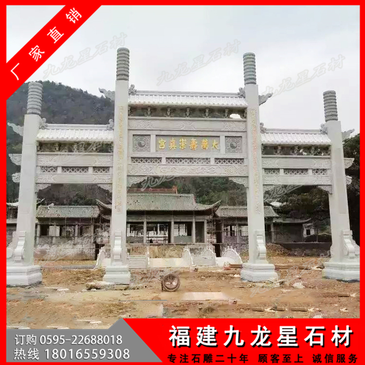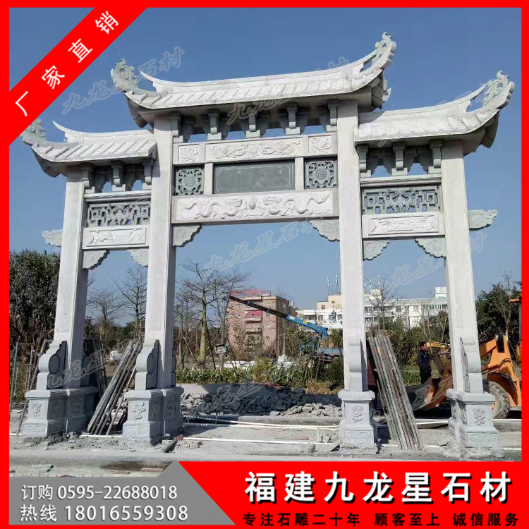 第二:牌坊大小,大型牌坊也有大小之分,筆者見過最大的牌坊高達(dá)6米,左右寬12米,深3米,整座牌坊完全采用立柱搭建,造型別致,精妙絕倫,這樣的大型牌坊價(jià)格是非常高的,當(dāng)時(shí)聽聞,需要幾千萬制作而成。但是普通的三門牌坊也可以稱之為大型牌坊,價(jià)格不過幾萬到十幾萬也非常多。主要是越大的作品,需要加工的工藝和使用的石料都會增加,并且后續(xù)的運(yùn)輸,安裝也會非常的繁瑣導(dǎo)致的。